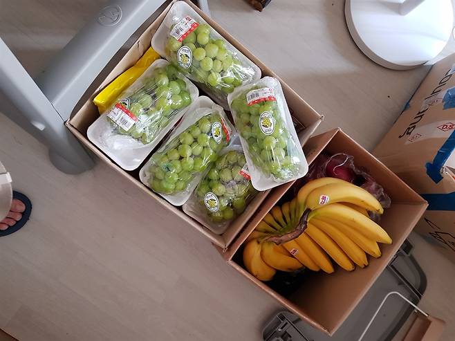 | ▲ 이모할머님의 선물 아기가 제일 좋아하는 바나나와 샤인머스켓 |