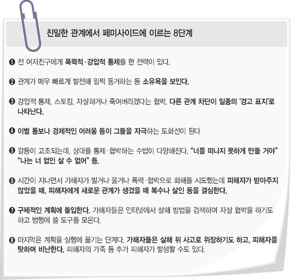 이와 같은 살해의 전조가 판결문 142건 곳곳에 상흔처럼 새겨져있다. 이 조짐은 비단 신체적 폭력에 국한되지 않는다. 가해자들은 교제 초기에 형성된 신뢰관계를 덫으로 삼아 피해자를 정서적·심리적으로 옭아맸다. 연구자들은 이런 단서들을 연결해 교제살해에 이르는 ‘패턴’을 발견한다. 영국 글로스터셔대학의 제인 몽턴 스미스 공공안전학과 교수는 친밀한 관계의 파트너로부터 발생하는 ‘페미사이드’에서, 죽음에 이르기까지 총 8단계가 존재한다고 분석한다.
