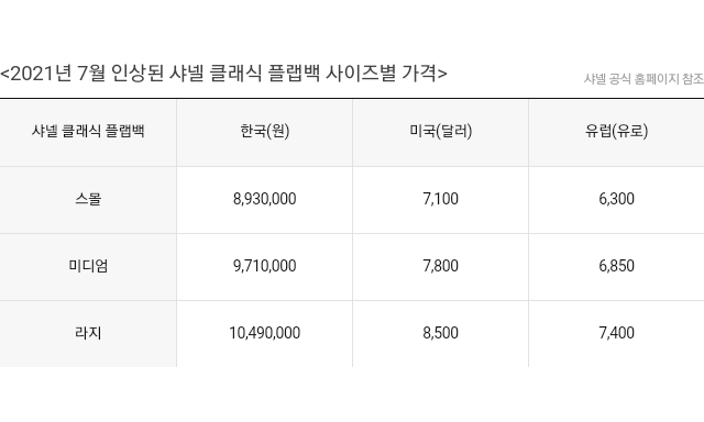 그렇다면 유럽 기준 가격은 어떨까. 프랑스, 이탈리아 등 유럽에선 이달부터 샤넬 플랩백 스몰 가격은 6,300유로(약 848만 원), 미디엄은 6,850유로(약 922만 원), 라지 7,400유로(약 996만 원)으로 바뀌었다.
