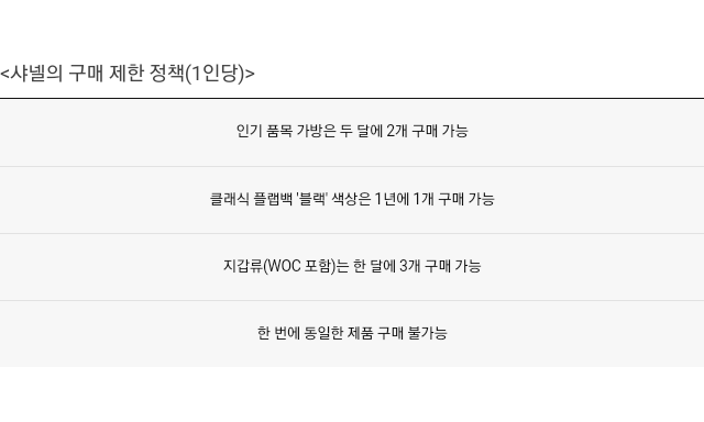 또한 지갑류(WOC 포함)는 한 달에 3개까지 구입할 수 있다. 모든 상품에 대해서 한 번에 동일한 제품을 구매할 수 없는 규칙도 둔 것으로 전해졌다. 클래식 라인 가방이 아니라도 미니 19백을 한 번에 2개 살 수 없다. 돈이 많아도 원하는 제품을, 원하는 시기에 얻을 수 없다는 말이다.