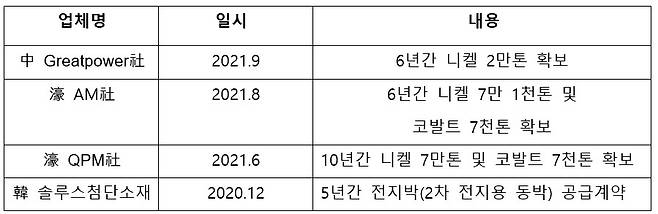 또한 지난 6월엔 호주의 니켈, 코발트 제련기업인 QPM社에 약 120억원을 투자해 지분 약 7%를 인수하고, 니켈과 코발트 장기 구매계약을 체결했다. LG에너지솔루션은 ‘23년 말부터 10년간 니켈 7만톤과 코발트 7천톤을 공급받게 된다.