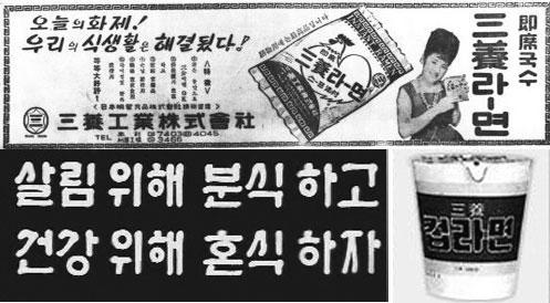 이때 밀가루는 삼백산업 중 하나로 미국에서 원료를 값싸게 들여와서 만들었기 때문에 많은 양을 싼값으로 소비자에게 공급할 수 있었기에 이러한 정책이 가능했습니다. 밀가루 소비를 높이기 위해 ‘쌀밥보다 영양가가 우수한 밀가루 음식’, ‘밀이 쌀보다 영양가가 우수하여 밀을 주식으로 하는 서구인이 한국인보다 크고 건강하다’는 식의 프로파간다도 잊지 않았죠.