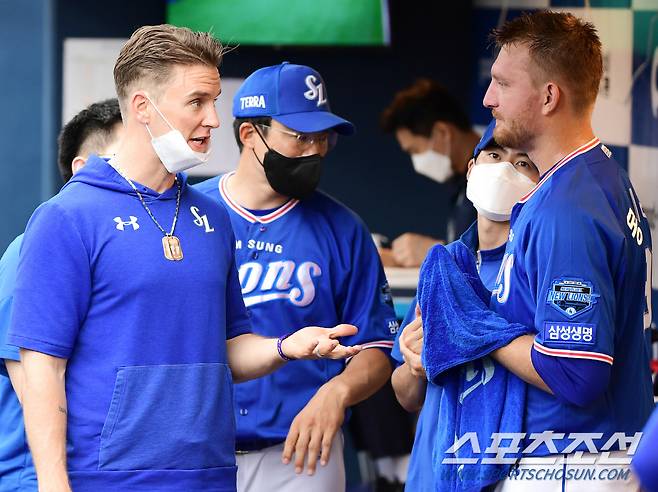 4일 창원 NC파크, KBO리그 삼성과 NC의 경기. 몽고메리가 3회까지 무실점 피칭을 했다. 뷰캐넌이 몽고메리와 이야기를 나누고 있다. 창원=정재근 기자 cjg@sportschosun.com/2021.7.4/