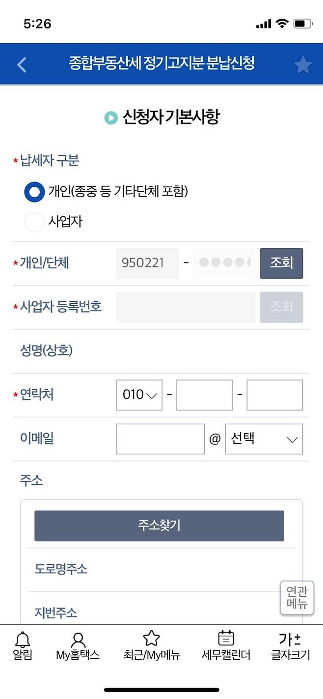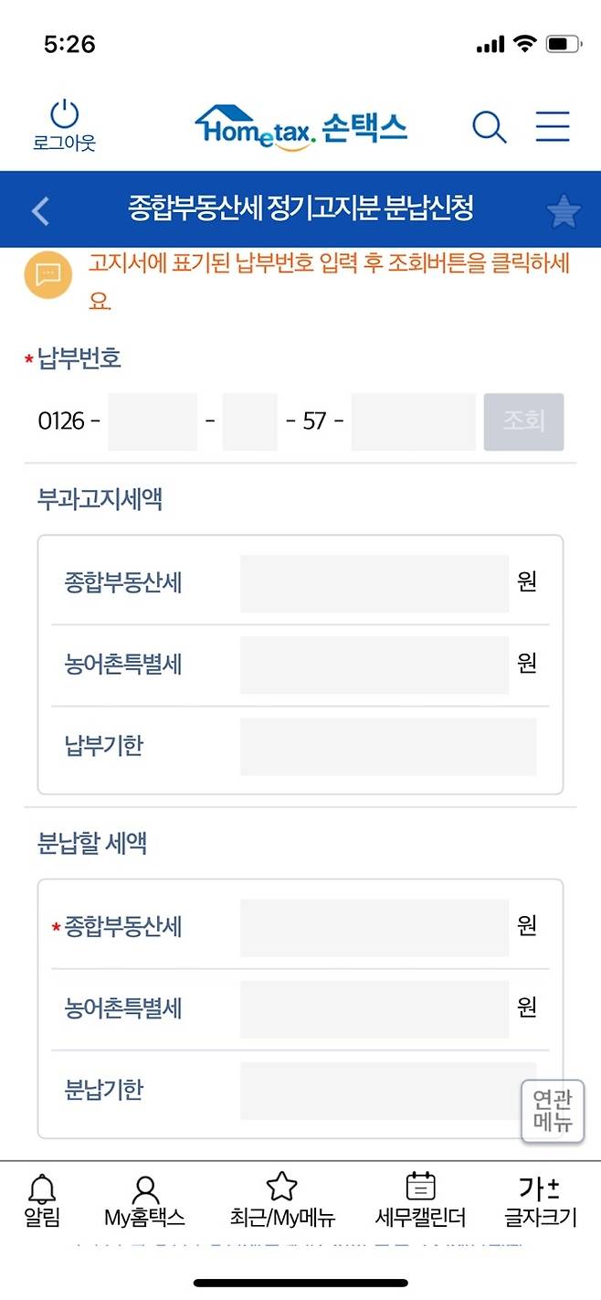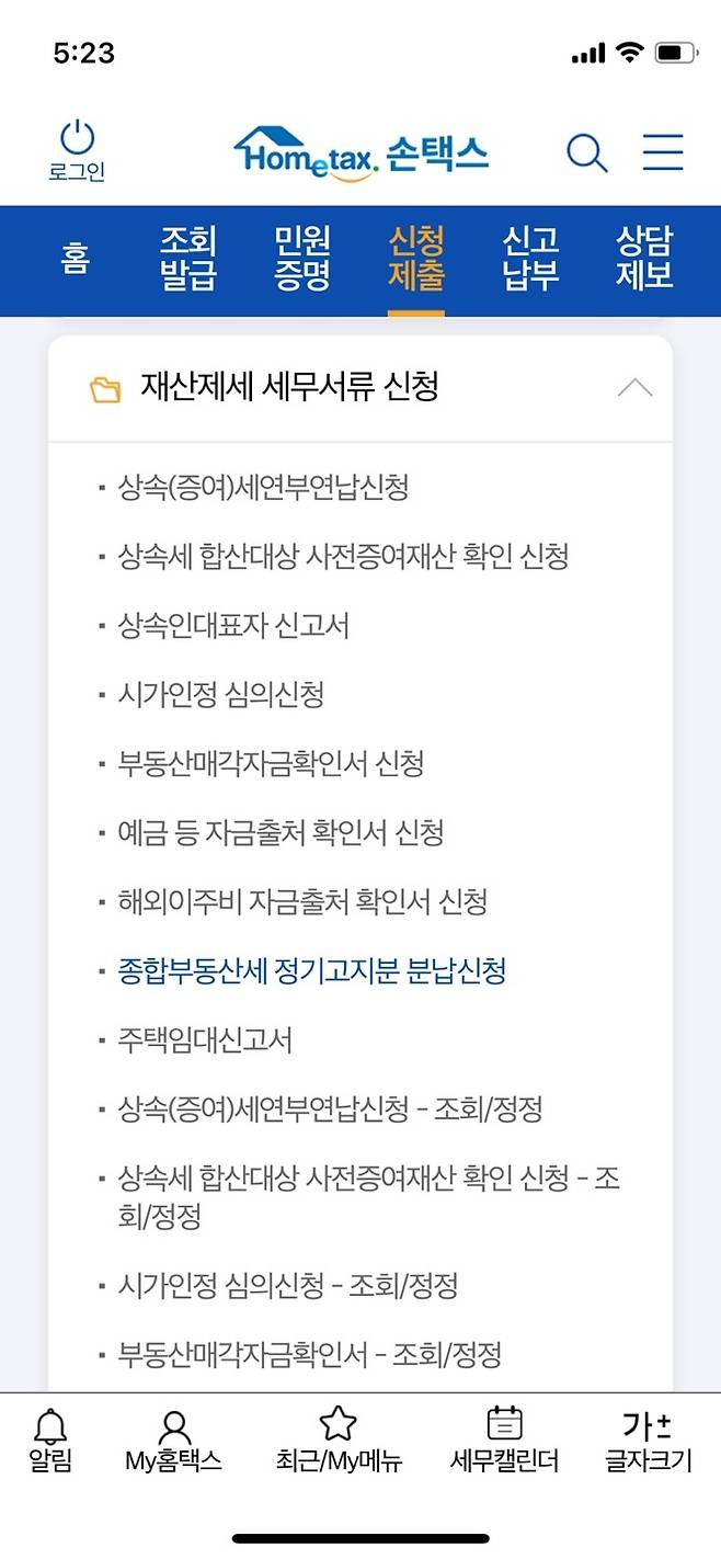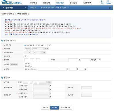 신청/제출 – 재산제세 세무서류 신청 – 종부세 정기분 분납신청