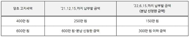 종합부동산세 대상자는 12월 15일(수)까지 신고·납부해야 합니다. 하지만 예상치 못한 세금으로 가계에 부담이 되는 분들을 위해 ‘종합부동산세 분납신청’이라는 제도가 있어요. 종부세액이 250만 원이 넘으면(초과), 내년 6월까지 할부처럼 나눠서 낼 수 있는 제도입니다.