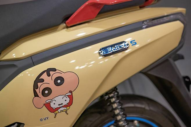 하지만 팝업스토어 전시부스 중에서도 대원미디어와 DNA모터스의 협업으로 진행된 짱구 컬레버레이션 스쿠터의 전시가 눈길을 끈다. 짱구 공식 인스타그램 계정을 통해 팬들에게 사전 설문투표를 거쳐 선정된 디자인을 전기스쿠터에 래핑 작업으로 구현한 것이다. 짱구의 팬이라면 한번쯤 타보고 싶었을 떡잎유치원 버스 디자인이 투표에서 뽑혔으며 그대로 재피에 입혀졌다. 캐릭터들이 총출동한 아기자기한 디자인의 스쿠터가 전시되었다. 팝업스토어 현장에서 3만원 이상 구매 시 이벤트에 응모할 수 있으며 당첨 시 세상에 단 하나뿐인 떡잎유치원버스로 랩핑된 재피의 주인이 된다. 팬들에게는 정말 큰 선물이 될 것이다.