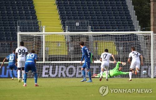 epa09489794 Empoli's Nedim Bajrami (L) scores the 3-1 lead from the penalty spot against Bologna's goalkeeper Lukasz Skorupski (2-R) during the Italian Serie A soccer match between Empoli FC and Bologna FC at Carlo Castellani Stadium in Empoli, Italy, 26 September 2021. EPA/Claudio Giovannini