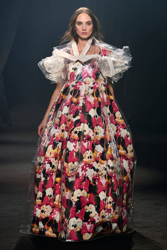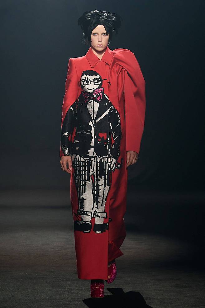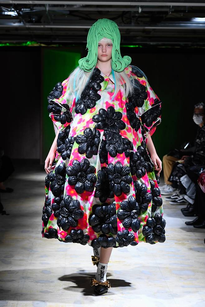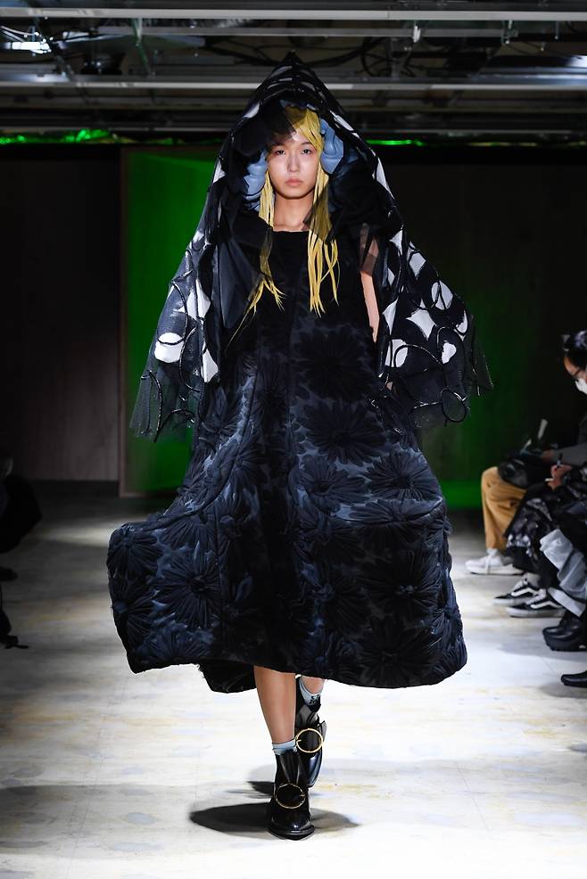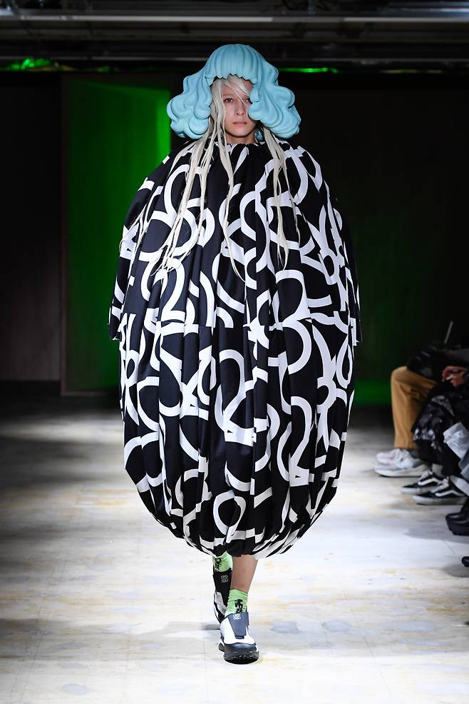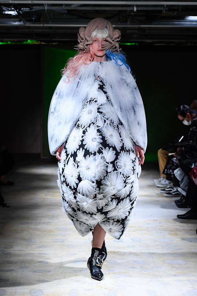 우리가 여기서 본 것 또한 예외는 아니었다. 21가지의 룩들은 우리가 알아볼 수 있는 옷보다는 걸어 다니는 조각상을 더 닮았다. 이번 시즌 우리가 본 많은 신체 중심적인 작품들에 대한 맞대응이라도 하듯, 옷을 입은 사람의 형상이 만화 같은 꽃잎과 달걀 모양의 고치들로 어깨가 접히고 거대한 소매로 과장되게 꾸며졌다. 거대하고 픽셀화된 하운즈투스 프린트와 부어오른 검은 비닐의 데이지 아플리케들은 패션 그 자체라기보다 부풀려진 가구처럼 느껴졌다. 매우 탄탄한 천으로 된 패널이 인간의 형태를 알아볼 수 없도록 눈을 속이는 역할을 했다. 어렵게 들릴지 모르지만, 이게 바로 우리가 종종 탐구하기를 잊어버린 패션의 광범위함을 일깨우는 반가운 일이었다. 쉽게 말해, 컨셉추얼한 예술 작품 생산에 상업적인 제품처럼 쉽게 적용되는 매체로서 내재하여있는 유연성에 관한 증명이었다. 우리가 여기서 본 것은 레이 카와쿠보 본인이 적은 것처럼, “거친 바위가 씻겨 내려가고 강 아래로 쓸려 내려간 후에 얻을 수 있는 단순한 조약돌과 같다”라고 말한 생각이 현실이 되는 순간이었다. MS