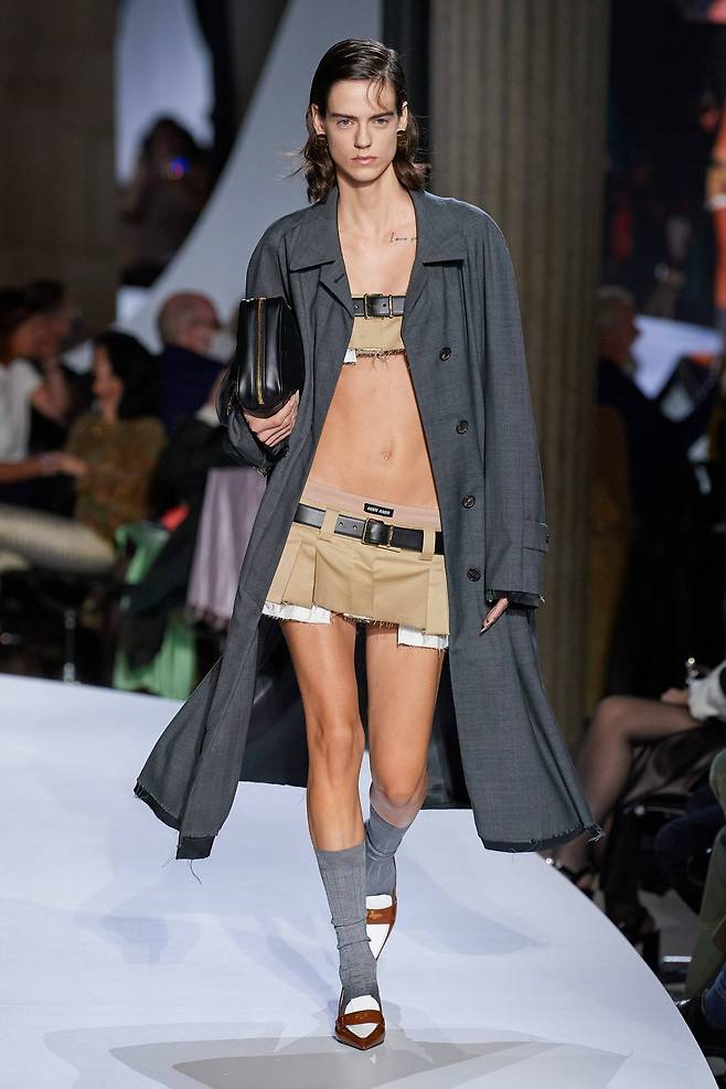 미우미우(Miu Miu)의 등장으로, 미우치아 프라다(Miuccia Prada)는 교복의 규칙을 어기고 너무 섹시해서 방과 후 수업을 들어야 할 정도의 노출이 심한 옷들을 선보였다. ...베이비 원 모어 타임 뮤직비디오(…Baby One More Time video)에 나오는 브리트니 스피어스(Britney Spears)를 생각해보라, 플리츠 스커트에 바삭거리는 면 셔츠는 가능한 한 더 노출하기 위해 올라간 옷이었다. 벨트는 조디 마쉬 같은 튜브 톱이 되었고 꽈배기 니트 스웨터는 브리트니같이 브라가 살짝 보이는 선으로 찢겨 있으며, 허리선은 낮은 위치로 속옷이 겉옷이 되었다. 눈에 띄는 것은 Y2K 향이 나는 Z세대(Y2K-flavoured Gen-Z)를 위한 미끼라는 것이다. 미우미우의 자극적인 쇼에 대해 알아야 할 모든 것이 담긴 전체 리뷰를 꼭 읽어보길. OA