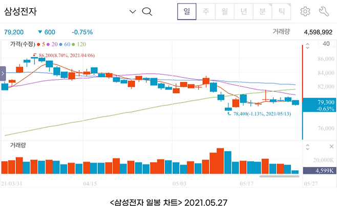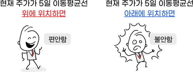 반대로 주가가 5일 이동평균선 아래에 있다면 불안한 상태라고 추정할 수 있죠.