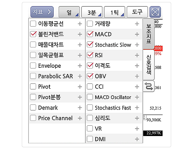 이런 기능이 있다는 걸 몰랐다면 HTS상에서 보조지표를 눌러보고 당황할 수도 있습니다.