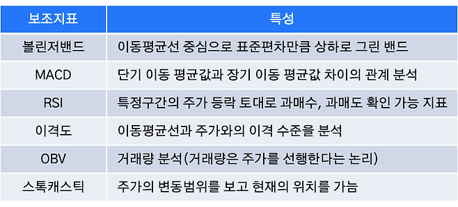 그 중 많이 쓰이는 보조지표는 아래와 같습니다.