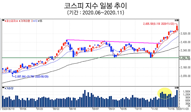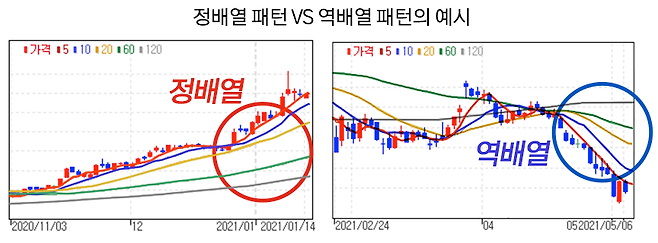 또 단기(5일, 10일, 20일)이동평균선과 장기 이동평균선(60일, 120일선)이 순차적으로 위치해 있을 때 보통 정배열이라는 말하는데, 이는 주가의 상승세가 강화되는 패턴으로 볼 수 있습니다.