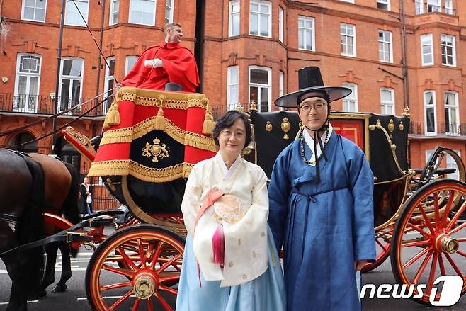 (서울=뉴스1) 노민호 기자 = 김건 영국주재 한국대사가 26일(현지시간) 우리 전통 갓과 한복을 착용하고 버킹엄궁에서 엘리자베스 2세 영국 여왕에게 화상으로 신임장을 제출했다. 이날 버킹엄궁까지 이동은 영국 왕실이 보낸 마차를 이용했다. 사진은 김 대사 부부가 마차 앞에서 기념촬영을 하고 있는 모습. (주영국한국대사관 제공)2021.10.27/뉴스1