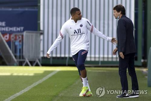 epa09433336 Paris Saint Germain's Kylian Mbappe (L) talks with Paris Saint Germain's Sportive Director Leonardo during a training session at the Ooredoo training center in Saint-Germain en Laye, near Paris, France, 28 August 2021. EPA/YOAN VALAT