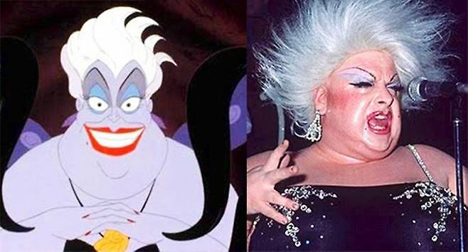 그야말로 전체적인 특징 대부분이 우르슬라의 탄생 에 영향을 미쳤다고 해도 과언이 아닌데요, 실제로 인어공주의 제작사 디즈니측에서도 당초 캐릭터 제작 과정에서 설계 자체를 디바인을 목표로 했다고 밝힌 바 있습니다. 우르슬라와 디바인을 나란히 놓고 보니