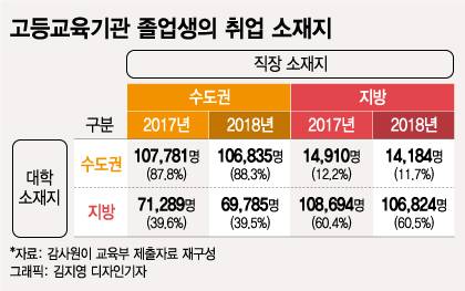 반면 수도권 대학 졸업생의 지방 일자리 취업률은 11.7%에 그쳤다. 전체 대학 졸업생 중 수도권과 지방에 취업한 비율은 각각 59.3%, 40.7%다. 이 통계는 감사원이 교육부에서 제출받은 자료를 재구성한 것으로, 상세한 취업정보가 확인된 사람을 대상으로 분석했다. 교육부가 관련 자료를 공개한 건 처음이다.