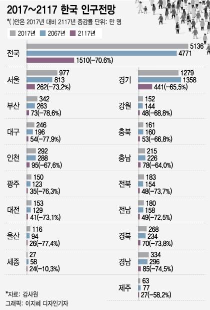 통상 인구 100만을 상회하는 광역시들은 전부 몰락한다. 서울과 경기(441만명)를 제외하면 100년 후 인구 100만을 넘는 시·도는 한 곳도 없다. 342만명인 부산 인구가 2117년 73만명으로 73.2% 감소하고, 대구도 2017년 246만명에서 100년 후 54만명으로 쪼그라든다. 150만명, 153만명인 광주와 대전도 100년 뒤 35만명, 41만명의 중소도시가 된다.