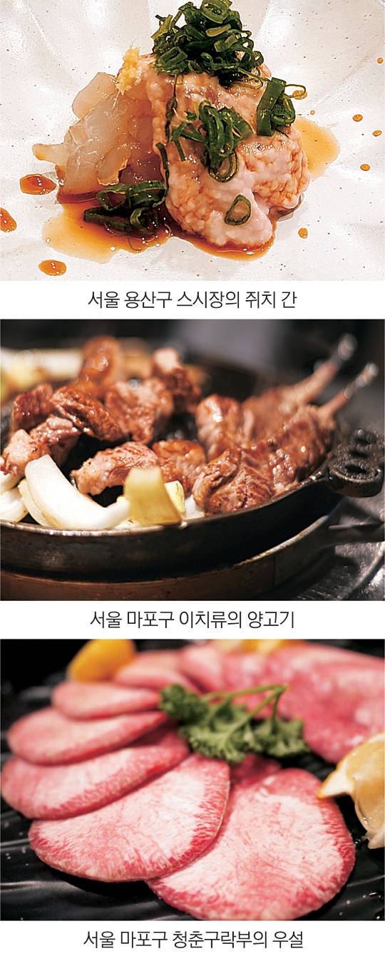◇양 = 삿포로(札幌)식 ‘칭기즈칸’ 방식으로 양을 굽는 이치류. 마치 투구처럼 생긴 두꺼운 전용 무쇠 불판에 채소와 양고기를 올려 익혀 먹는다. 호주산 1년 미만의 램을 사용하고 생갈비, 살치, 생등심 등 부위별로 판다. 양 특유의 달큼한 냄새가 전혀 나지 않는 부드러운 고기를 일일이 구워준다. 채소를 고기 기름에 구워 특제 양념 소스에 찍어 먹는 맛이 일품이다. 서울 마포구 잔다리로3안길 44. 2만9000원.