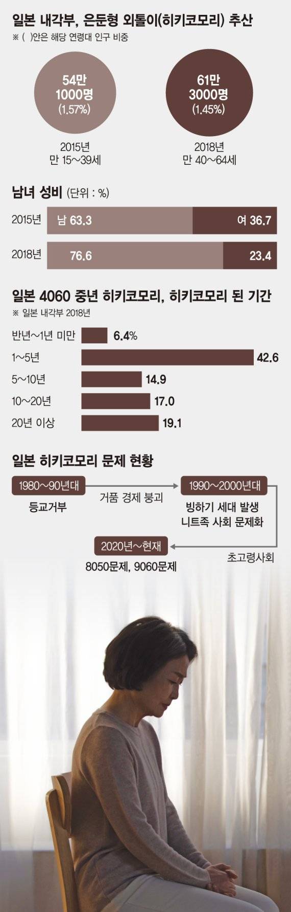보통, 집에서 한 발자국도 나가려 하지 않는 은둔형 외톨이를 중증 또는 협의의 히키코모리라고 부른다면, 광의의 히키코모리는 편의점 정도는 다닐 수 있거나 정규직 등의 활동은 간신히 하고 있지만 일상생활에 어려움을 겪고 있는 경증자까지 포함한 수치다. 2018년 일본 내각부 조사에서 주목할 점은 4060대의 히키코모리가 1030대보다 더 많다는 점이다. '히키코모리=1030대 젊은층의 문제' 라는 공식이 깨진 것이다. 히키코모리 문제는 1980~90년대에는 등교 거부 정도로만 인식됐는데 1990년~2000년 대들어서는 일본의 거품경제 붕괴(1991년)와 맞물리면서 더욱 심화됐다. 일본의 '잃어버린 20년, 30년'과 궤를 함께하는 이른바 '취업 빙하기 세대(버블붕괴 직후 고교·대학을 졸업해 안정된 일자리를 구하지 못한 경우)가 여기서 잉태된 것이다.