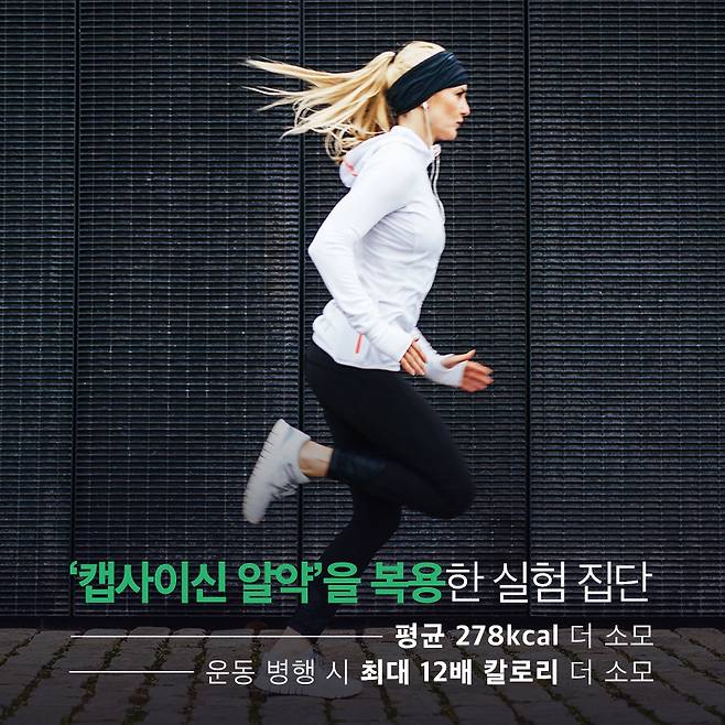실제 연구결과도 놀라운데요. 미국 오클라호마 대학의 실험에 따르면 캡시플렉스를 복용한 실험 집단은 가짜 약을 투여한 집단보다 운동하기 이전, 도중 또는 이후에 278칼로리를 더 소모한 것으로 조사됐어요. 게다가 운동과 병행할 경우 최대 12배의 칼로리를 더 소모시키는 것으로 나타났습니다.