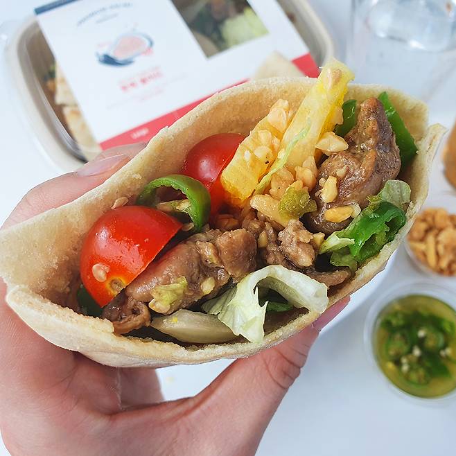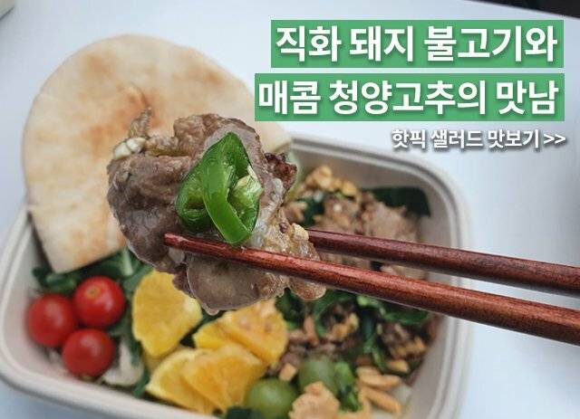 특별한 매운맛을 즐기고 싶다면 프레시코드의 핫픽 샐러드를 드셔보시는 건 어떨까요? 핫픽 샐러드의 특제 청양고추 소스에는 사과즙이 첨가되어 새콤달콤함이 곁들여진 기분 좋은 매콤함을 느낄 수 있습니다. 거기다 피타 브레드에 고기와 샐러드를 넣어 나만의 샌드위치로 즐길 수도 있죠. 청포도와 오렌지로 깔끔하게 식사를 마무리할 수 있는 것도 장점이에요.