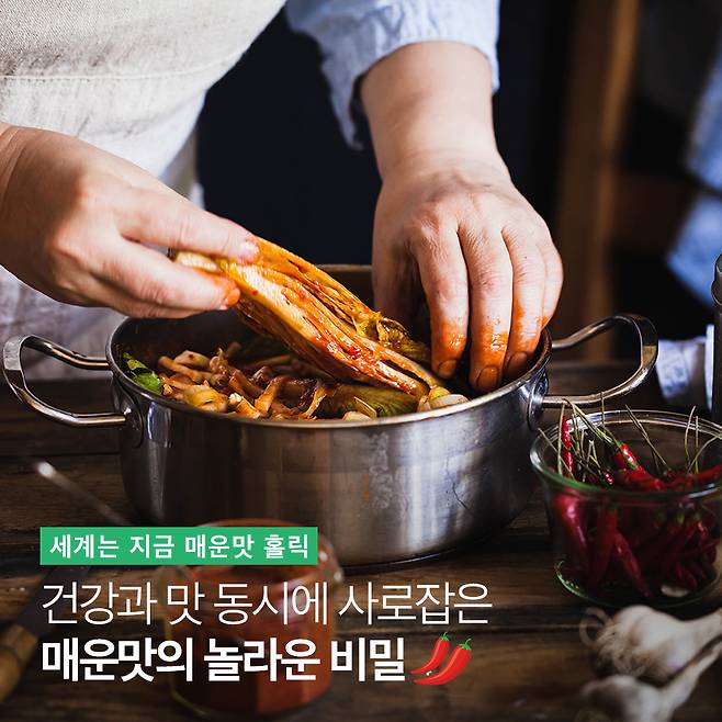 지난해 김치 수출이 역대 최대를 기록한 가운데, 전 세계의 매운맛 열풍은 사그라들 줄 모르고 있습니다. 2012년 출시된 불닭볶음면은 외국인들 사이에 '한국인도 손사래를 치는 매운 라면'으로 알려지며 판매량 30억 개를 돌파했습니다. 아마존에서 시즈닝 부문 판매 1위를 달리고 있는 제품도 바로 김치 시즈닝이죠. 김치 시즈닝을 만든 푸드컬쳐랩 안태양 대표는 '건강하고 지속 가능한 라이프 스타일을 제시'했다고 하는데요. 과연 매운맛은 정말 건강한 맛인지, 자세히 알아볼까요?