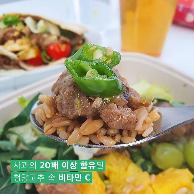 어딘가 모자른 매운맛에 아쉬움이 느껴진다면, 한국인에게 익숙한 청양고추 소스를 샐러드에 첨가하는 건 어떨까요? 청양고추에는 단백질, 탄수화물을 비롯해 각종 식이섬유와 칼슘, 인, 철분, 칼륨 등의 무기질이 풍부하게 함유되어 있어요. 특히 여느 채소나 과일보다 비타민 C를 훨씬 더 많이 함유하고 있는데요. 심지어 사과의 20배 이상이 함유되어 있다고 합니다.