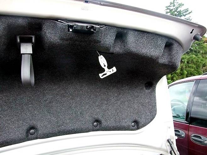 트렁크는 외부에서뿐만 아니라 내부에서도 여는 것이 가능합니다. 트렁크 안에 갇히게 되었을 땐 당황하지 말고 트렁크 개폐 장치가 있는 방향으로 시선을 향하면 야광 레버를 쉽게 발견하게 됩니다. 이 레버는 손가락 한두 개가 들어갈 정도의 구멍 안에 자리하고 있어 평상시에는 눈에 잘 띄지는 않습니다만, 작은 힘으로도 작동이 가능합니다.