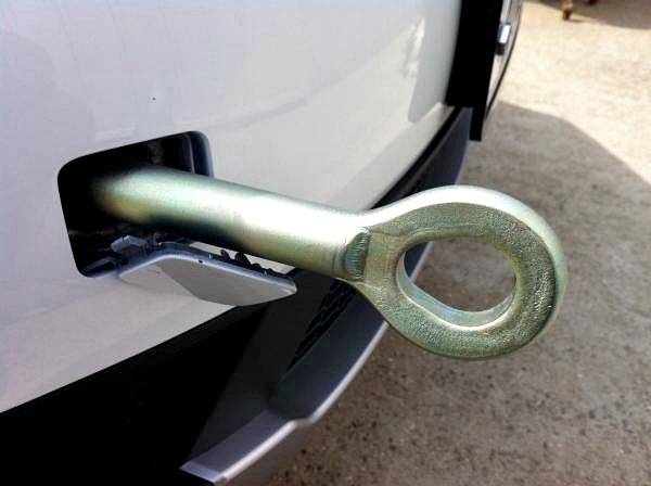 차량을 견인해야 할 때 차량 앞뒤로 걸 수 있는 견인고리가 반드시 필요합니다. 하지만 평상시 이게 노출되어 있으면 보기 매우 좋지 않을 것입니다. 그렇다고 하단에 숨겨 둘 경우 실제 견인을 했을 때 다양한 불편을 야기할 수 있는데 이런 이유로 요즘 나온 차들은 견인고리를 분리시켜 비상용 자동차 키트에 보관하고 필요할 때만 끼워 사용하도록 하고 있습니다.