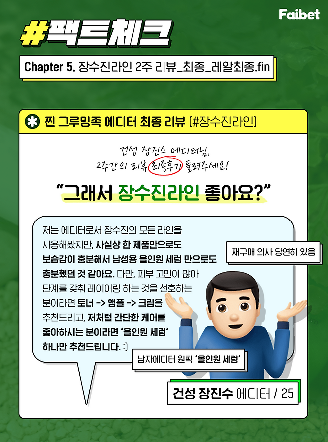 2주간 팩트맨 장수진 올인원과 장수진 라인 제품을 집중 리뷰해봤어.