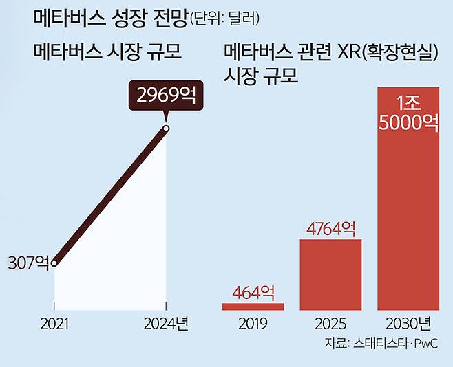 메타버스가 활발해지면서 시장 규모도 빠르게 성장하고 있다. 글로벌 통계전문업체 스태티스타에 따르면 메타버스 시장은 올해 307억달러(약 34조1077억원)에서 2024년 약 2969억달러(약 329조8559억원)까지 성장할 전망이다. 글로벌 회계컨설팅 업체 프라이스워터하우스쿠퍼스(PwC)에 따르면 메타버스의 관련 기술인 확장현실(XR) 시장은 2025년 4764억달러(약 548조원)을 기록하고, 2030년까지 1조5000억달러(약 1720조원) 규모로 커질 것으로 예상된다.
