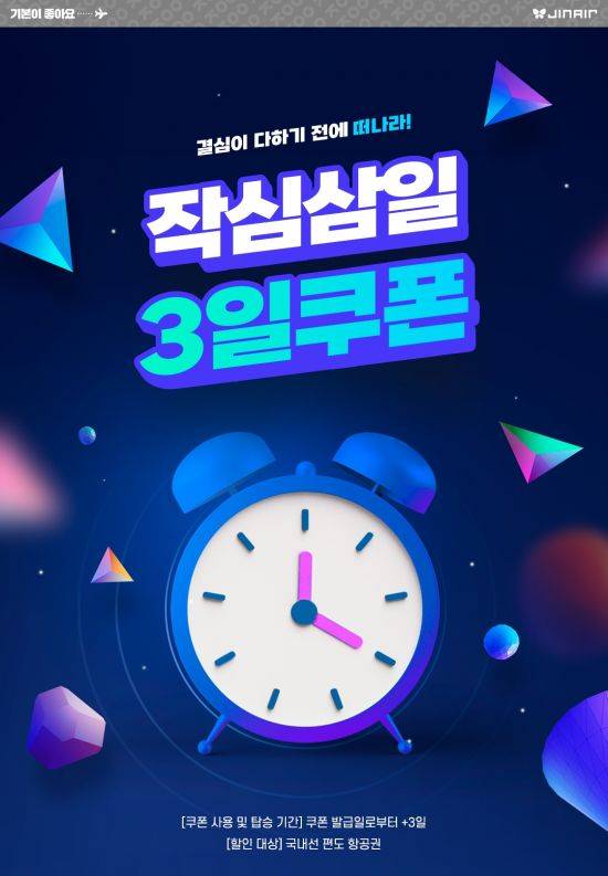 진에어는 출발 임박 국내선 항공편을 대상으로 예매 할인 혜택을 제공하는 작심삼일 3일 쿠폰 이벤트를 진행한다고 14일 밝혔다.