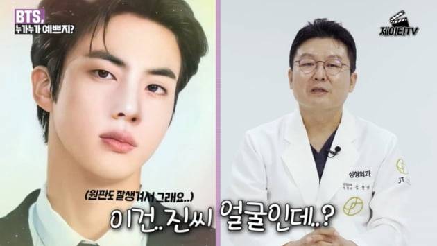방탄소년단(BTS) 진이 성형외과 전문의로부터 또 한번 이상적인 미남으로 뽑혔다. 성형외과 전문의가 이상적인 이목구비와 얼굴형을 조합해보니 바로 진의 얼굴이었던 것.