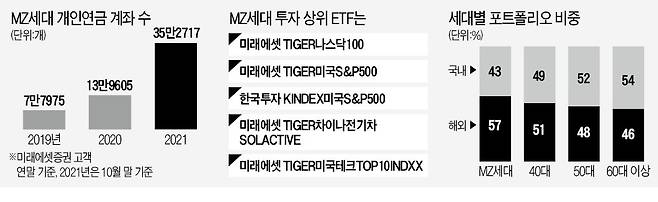 MZ세대(밀레니얼+Z세대)의 개인연금 가입이 폭발적으로 증가하고 있다. 이들 세대의 개인연금 계좌 수는 최근 50대 계좌 수를 넘어섰다. 평균 수명이 점차 늘어나는데다 노후 빈곤에 대한 불안감이 커지면서 일찌감치 은퇴 준비에 나선 것으로 풀이된다. 펀드 대신 상장지수펀드(ETF)에, 국내 대신 미국 증시에 투자하는 게 MZ세대의 연금 투자 트렌드인 것으로 나타났다.