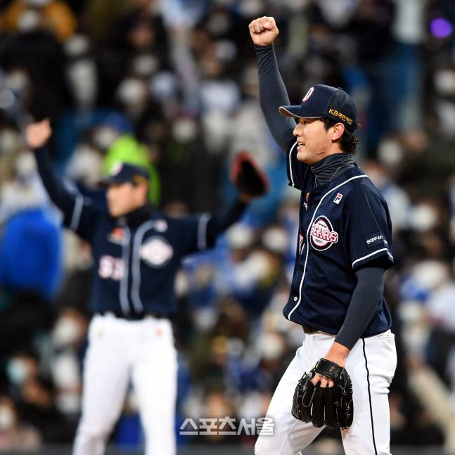 두산 투수 홍건희가 9일 대구 삼성라이온즈파크에서 열린 2021 KBO리그 포시트시즌 플레이오프 1차전 삼성 라이온즈와 두산 베어스의 경기 6회말 2사만루 상대 김지찬을 좌익수 플라이 아웃시킨 후 환호하고 있다.