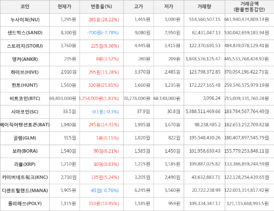 또한, 헌트(25.81%, 1,560원), 베이직어텐션토큰(14.45%, 1,940원), 하이브(11.28%, 2,910원), 폴리매쓰(10.95%, 1,115원), 스토리지(6.36%, 3,760원), 보라(6.21%, 1,540원), 카이버네트워크(5.24%, 2,710원), 앵커(3.52%, 235원), 리플(0.83%, 1,210원), 골렘(0.11%, 915원)이 상승세를 나타냈다.