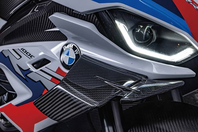 첫인상에서 느껴지는 존재감의 대부분은 윙렛에서 시작된다. 베이스모델인 3세대 S 1000 RR(이하 S RR)이 역대모델 중 가장 순둥한 디자인으로 평가되고 있지만 윙렛하나로 존재감과 날카로움이 더해졌다. 카본파이버 소재의 윙렛은 시속300km/h에서 16.3kg의 다운포스를 만든다. 하지만 일상적인 영역, 그러니까 시속 100km/h에서 생성되는 다운포스는 1.8kg에 불과하다. 실질적으로는 드레스업의 의미가 더 크게 느껴진다.