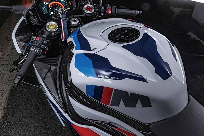 M RR의 국내사양은 컴페티션 패키지까지 더해 외장의 대부분을 카본파이버로 두르고 있다. 전체적으로 레이스 머신처럼 화려하게 꾸며졌다. 레이스 머신의 분위기를 더해주는 하이 윈드쉴드도 기본으로 장착된다. 조금 산만한 디자인의 데칼과 차체 전반에 M로고가 너무 많이 박혀있는 것이 조금 과하게 느껴지기도 한다. 과연 로고가 몇 개나 있을지 궁금해 세어보았는데 40개가 넘었다. 하지만 파츠 하나하나를 보면 끝내준다. 절삭가공 파츠와 카본섬유의 향연이다. 카본섬유 파츠는 림버거 카본, 절삭 파츠는 길레스 툴링에서 제작했다. 그리고 M 컴페티션 패키지가 카본 섬유를 아낌없이 쓰고 있음에도 스펙상 무게 차이가 차량 전체에서 0.2kg밖에 나지 않는 점은 미스테리다.(웃음) 이외에 헤드라이트를 비롯해 전체적인 페어링 등의 기본 디자인은 S RR에서 그대로다. 디자인에서도 좀 더 차별화를 주었어도 좋았을 것 같다. 그나마 전원을 켜면 계기반에 M로고가 선명하게 화면을 채우는 것이 꽤 멋지다. 1,300만 원을 더 주고 S가 아닌 M을 선택한 오너의 자부심을 채워주기 위한 노력일까?
