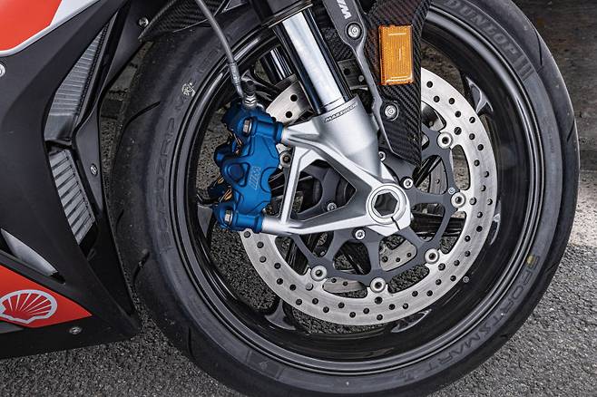 브레이크는 놀라운 수준이다. 레버의 작동 폭이 길지도 않음에도 짧은 스트로크 안에서 제동력의 상승이 확실하고 최대 제동력과 컨트롤성이 최고수준이다. 제동력이 새는 것 없이 모조리 전달되는 느낌이다. 이 강력한 브레이크 성능을 견인하고 있는 파란색 M캘리퍼는 쇼와 제품이다. 여기에 조합 된 마스터 실린더도 역시 쇼와제다. 현행 S 1000 RR에 사용된 HAYES 캘리퍼는 물론 이전의 브렘보 캘리퍼를 장착했던 S 1000 RR보다도 훨씬 좋은 퍼포먼스를 보여준다. BMW가 쇼와에게 요구한 사양은 “클래스 안에서 최고”였다고 하는데 실제로 최고속인 시속 306km/h로 달리다가도 10.7초 만에 완전히 정차할 수 있는 퍼포먼스를 보여준다. 실제 주행 시에도 손가락 하나로도 레버를 움켜지면 노면에 프런트 휠이 파고들 기세로 바이크를 세운다. 감속G가 너무 강해서 풀브레이킹 하는 게 무서울 정도다.