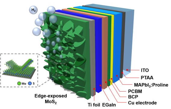 연구팀은 대표적인 물리적 증착 방법인 펄스드 레이저 증착법을 이용해 대표적인 백금 대체 수소 생성 반응용 촉매 중 하나인 MoS2를 페로브스카이트 보호층(티타늄 포일) 위에 제작했다. 티타늄 포일 위에 MoS2를 제작할 때 증착 조건 중 하나인 펄스 수를 조절해 MoS2의 나노 구조를 성공적으로 제어했다. 나노 구조화된 MoS2는 평면 구조의 MoS2보다 더 높은 효율의 수소 생성 반응을 보였다. 이어 MoS2가 증착된 티타늄 포일을 액체금속인 인듐-갈륨 합금으로 밀봉해 수분이 페로브스카이트 물질에 침투하는 것을 성공적으로 방지해 안정성을 꾀했다.