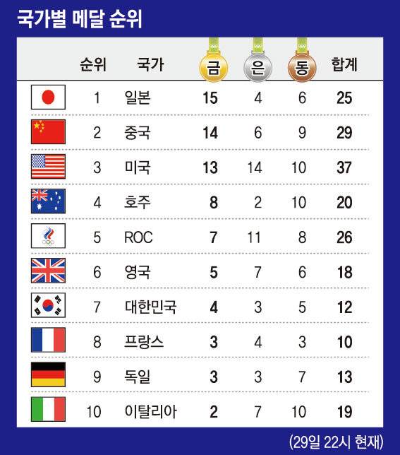 국가별 메달 순위 (29일) [2020 도쿄올림픽]