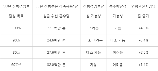 현재 연간 산림경영증가율(1.4%포인트)을 유지할 시 2030년에 68.8%에 도달해 국가온실가스 감축목표 상향안인 2550만톤 달성의 어려움이 예상된다.