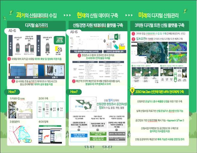 먼저 과거는 2023년까지 전국 243개 지자체의 과거 2015년 이후 산림경영활동(조림, 숲가꾸기) 대장자료를 수집해 공간정보(GIS DB)로 구축하는 '디지털 숲 가꾸기'를 추진한다.