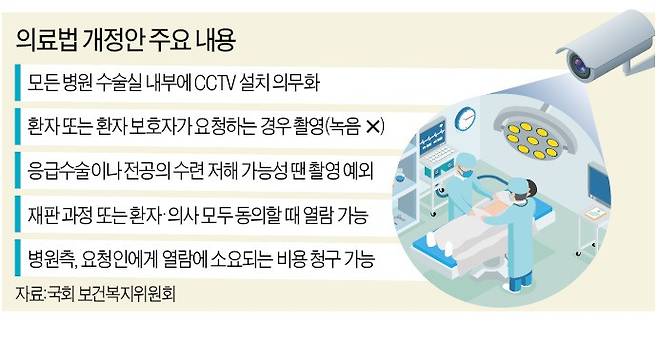 개정안에 따르면 전신마취 등 환자의 의식이 없는 상태에서 수술할 경우 병원은 수술실 내부에 CCTV를 반드시 설치해야 한다. 환자와 보호자는 병원에 수술 장면 촬영을 요청할 수 있고, 촬영한 영상은 의료분쟁이 벌어졌을 때나 환자와 의료진 모두 동의했을 때 열람이 가능하다. 응급수술과 전공의 수련을 저해할 우려가 있으면 의료진이 촬영을 거부할 수 있도록 했다. 더불어민주당 복지위 간사인 김성주 의원은 “대리수술과 성추행이 의료 현장에서 근절될 것”이라고 했다.