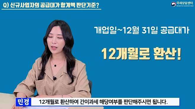 직전 연도(또는 해당 연도)에 신규로 사업을 개시한 사업자인 경우 개업일로부터 12월 31일까지 공급대가 합계액을 12개월로 환산하여 간이과세자 해당여부를 판단해주시면 됩니다.