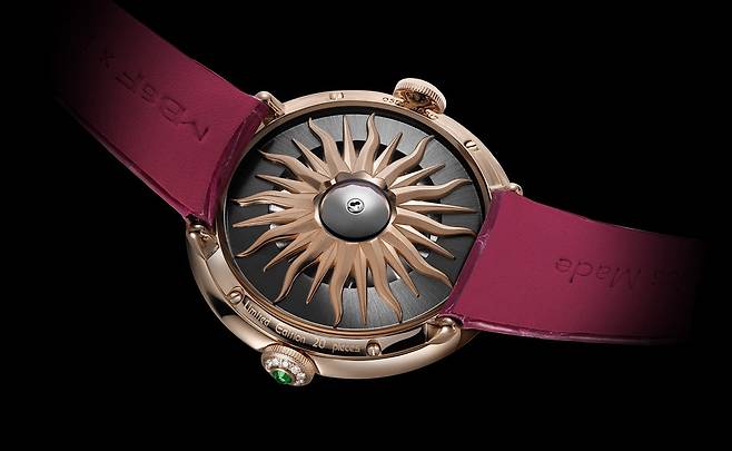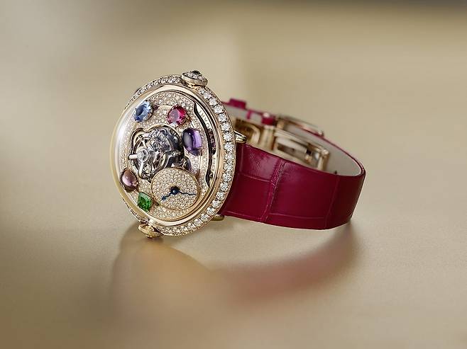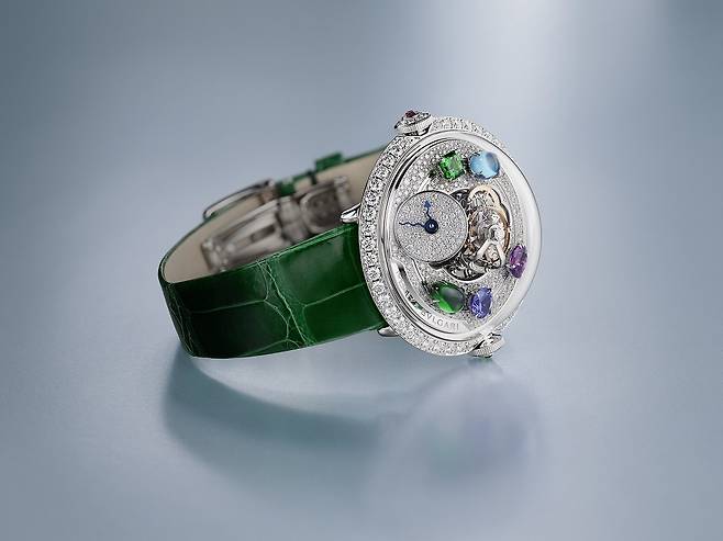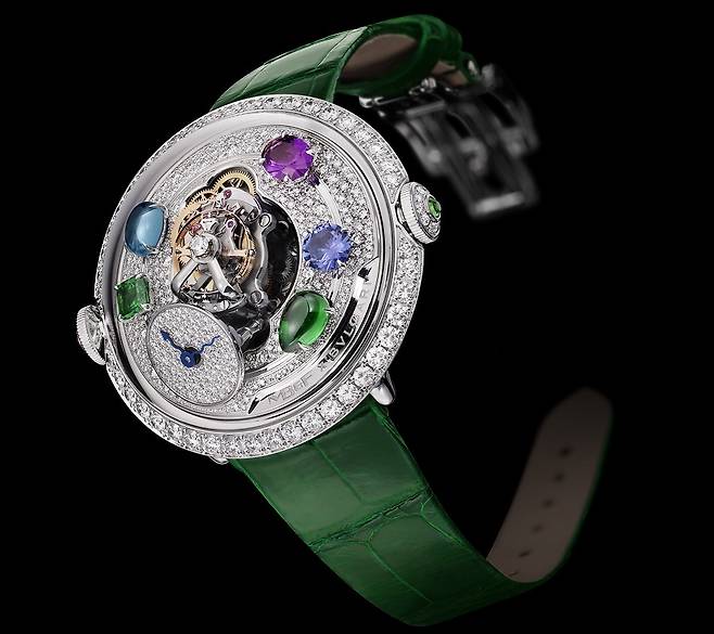 반면 레드 골드 버전에는 2개의 스퀘어, 라운드 컷 차보라이트(약 0.38캐럿), 2개의 오벌, 라운드 컷 토르말린(약 0.64캐럿), 1개의 오벌 컷 탄자나이트(약 0.47캐럿), 1개의 페어 컷 아메시스트(약 0.7캐럿), 1개의 라운드 컷 루벨라이트(약 0.39캐럿)를 다이얼 위에 떠도는 행성처럼 장식해 미학적인 방점을 찍습니다.