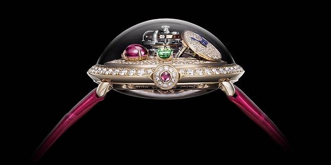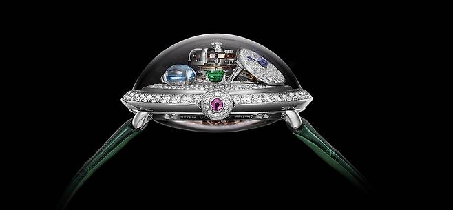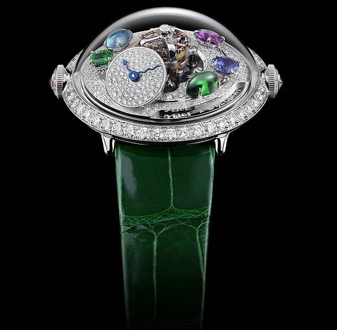 슈퍼-돔형의 사파이어 크리스탈과 비스듬히 기울어진 다이얼 등 LM 플라잉T의 독창적인 설계를 이어가면서 불가리의 탁월한 주얼리메이킹 노하우를 결합해 기존의 MB&F 컬렉션에서는 한 번도 접한 적 없는 궁극의 화려함을 보여주는 하이 주얼리 워치를 완성했습니다. 이 모델을 가리켜 두 브랜드는 LM 플라잉T 알레그라(FlyingT Allegra)로 명명하고 있습니다. 이름에서 예상할 수 있듯 올해 불가리가 발표한 알레그라 칵테일 워치의 영향을 어림할 수 있습니다.
