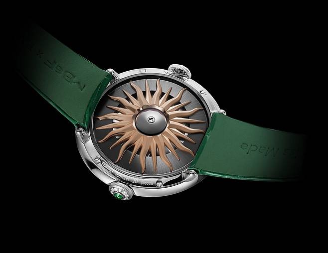 다이얼 중앙에는 분당 1회전하는 플라잉 투르비용 케이지가 특유의 건축학적인 브릿지 구조와 함께 노출돼 있습니다. 전작들처럼 투르비용 케이지 탑에도 1개의 라운드 컷 다이아몬드를 세팅했습니다. 루벤 마르티네즈(Ruben Martinez) 등 MB&F 소속 워치메이커들을 통해 인하우스 개발 제작된 해당 자동 무브먼트는 총 280개의 부품과 30개의 주얼로 구성돼 있으며, 시간당 18,000회 진동하고(2.5헤르츠), 파워리저브는 약 100시간을 보장합니다. 투명 사파이어 크리스탈 케이스백을 통해서는 태양에서 영감을 얻은 유니크한 3차원 골드 로터를 감상할 수 있습니다.