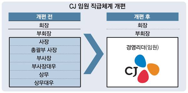 CJ는 사장·총괄부사장·부사장·부사장대우·상무·상무대우로 나뉘어 있는 6개 임원 직급을 '경영리더'로 통일하는 임원직제개편안을 지주 및 각 계열사 이사회에서 승인했다고 23일 밝혔다. 회장과 부회장을 제외한 모든 임원 직급이 통합되는 것이다. 개편안은 조만간 단행될 임원 인사에 적용해 내년 1월부터 시행될 계획이다.